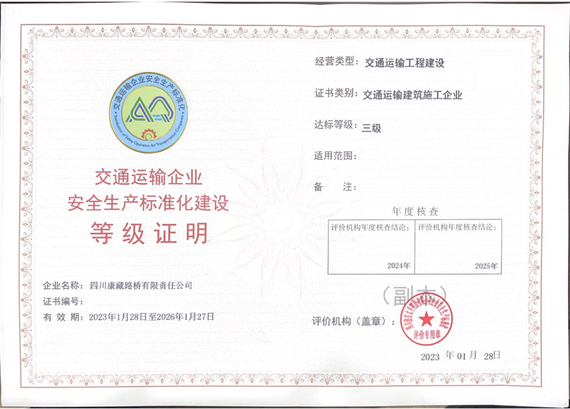 近日,經(jīng)四川省交通運(yùn)輸企業(yè)安全生產(chǎn)標(biāo)準(zhǔn)化評價機(jī)構(gòu)綜合評定,雅安交建集團(tuán)四川康藏路橋有限責(zé)任公司順利通過安全標(biāo)準(zhǔn)化三級評價驗收并獲得“安全生產(chǎn)標(biāo)準(zhǔn)化三級企業(yè)”等級證明證書。