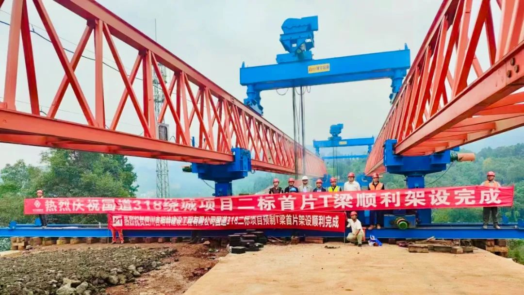 國道318線名山區(qū)黑竹(成都界)至雨城區(qū)多營段改建工程首片T梁成功架設(shè)