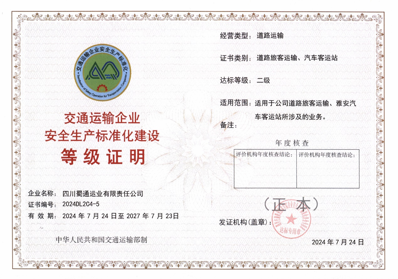近日,經(jīng)四川省交通運輸企業(yè)安全生產(chǎn)標準化評價機構綜合評定,雅安交建集團蜀通公司順利通過安全標準化二級企業(yè)驗收并獲得等級證書,標志著公司安全管理工作更趨于標準化,安全管理水平邁上了新臺階。