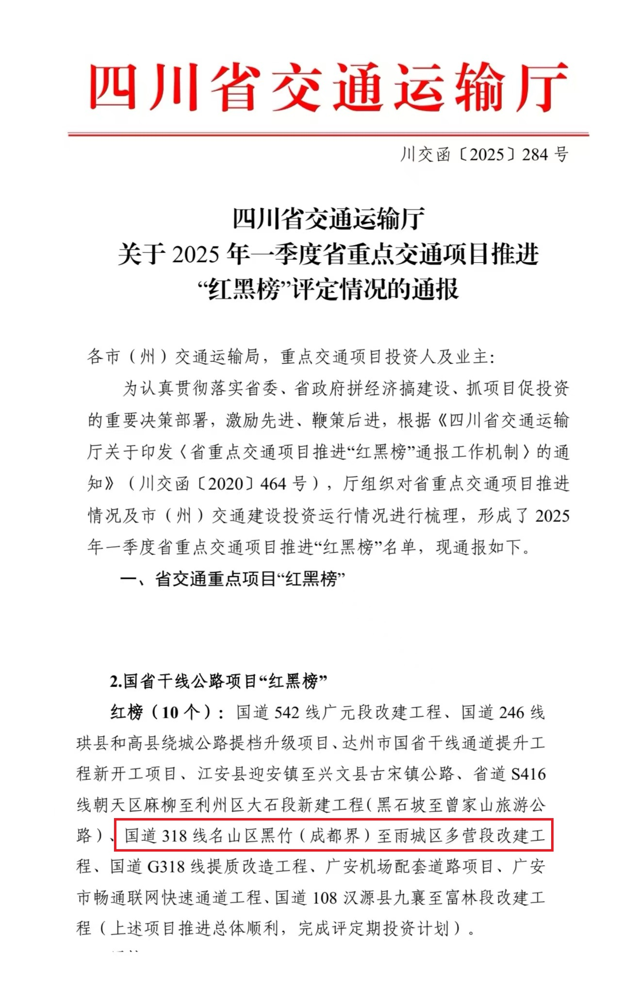 近日,四川省交通運(yùn)輸廳發(fā)布2025年一季度省重點(diǎn)交通項(xiàng)目推進(jìn)“紅黑榜”評(píng)選結(jié)果,由雅安交建集團(tuán)四川康藏路橋有限責(zé)任公司承建的國(guó)道318線名山區(qū)黑竹(成都界)至雨城區(qū)多營(yíng)段改建工程憑借超額完成投資計(jì)劃、關(guān)鍵節(jié)點(diǎn)取得突破等成效,成功入選國(guó)省干線公路項(xiàng)目“紅榜”。