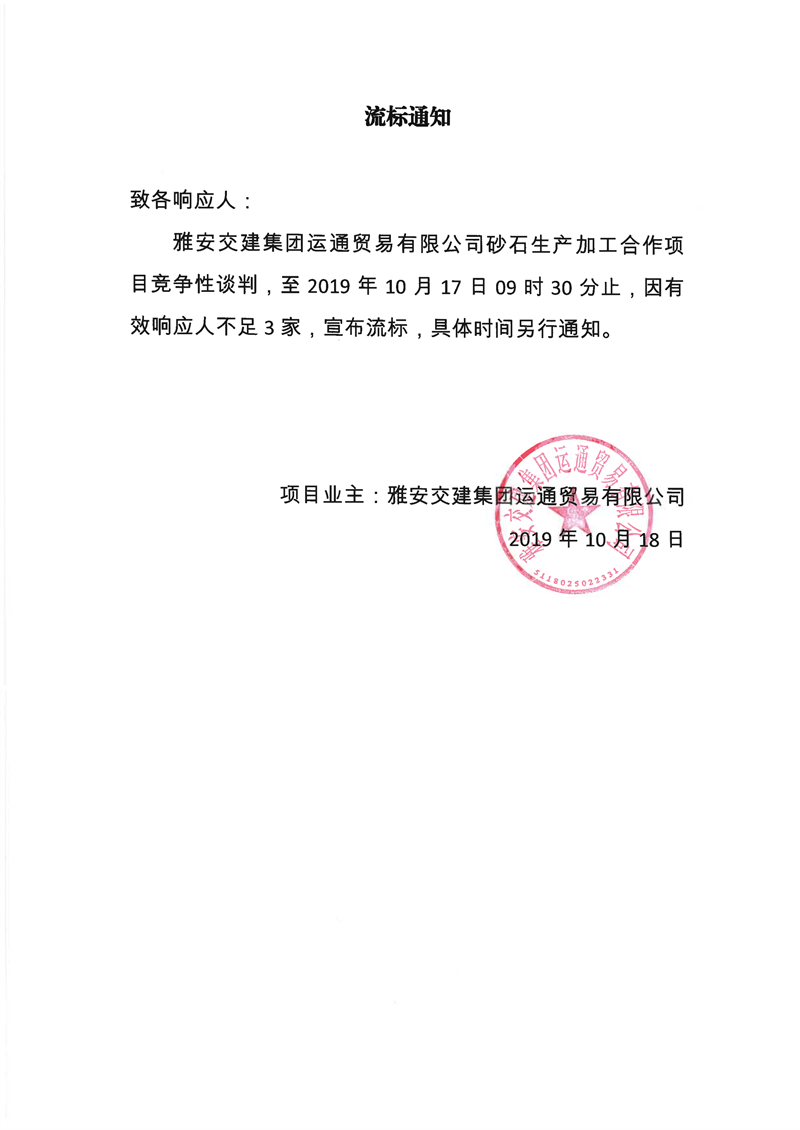 雅安交建集團(tuán)運通貿(mào)易有限公司砂石生產(chǎn)加工合作項目流標(biāo)通知