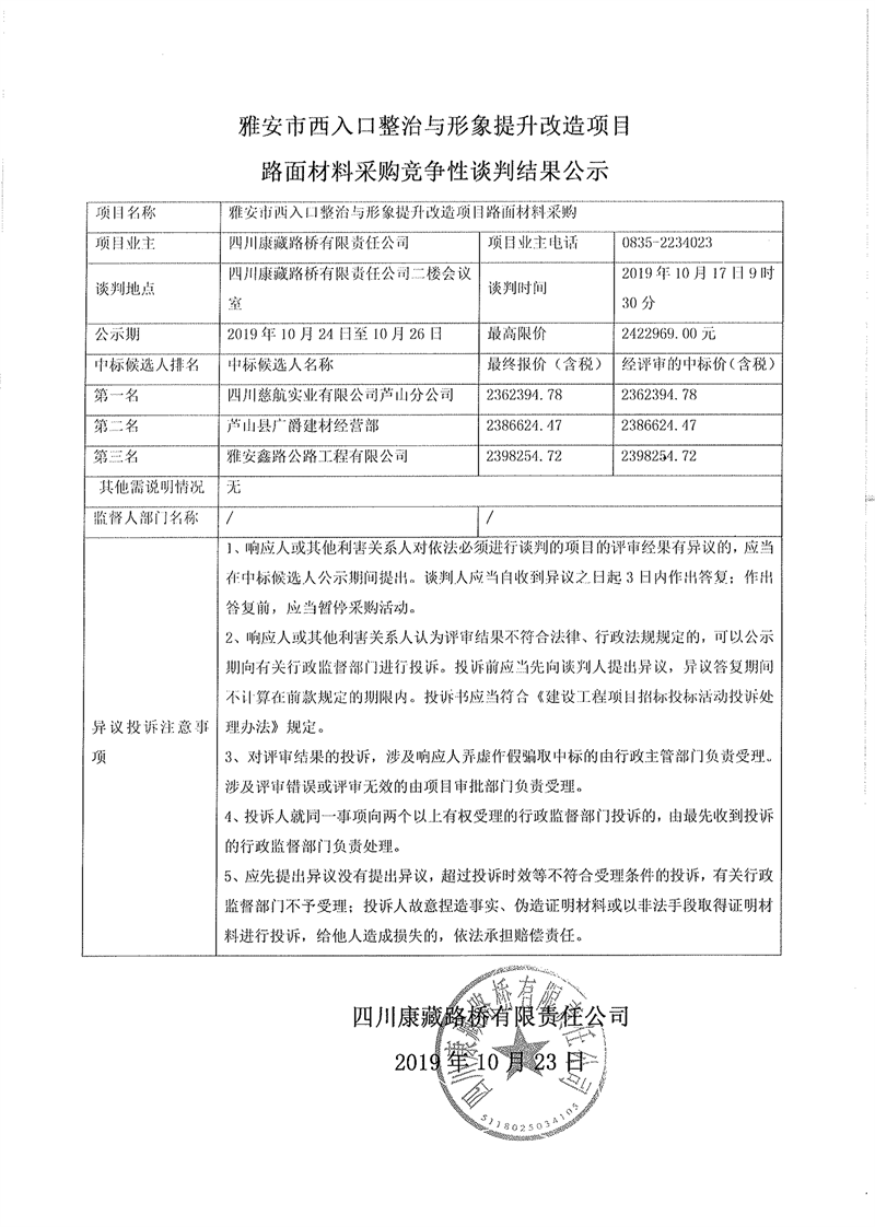 四川康藏路橋有限責(zé)任公司雅安市西入口整治與形象提升改造項目路面材料采購競爭性談判結(jié)果公示