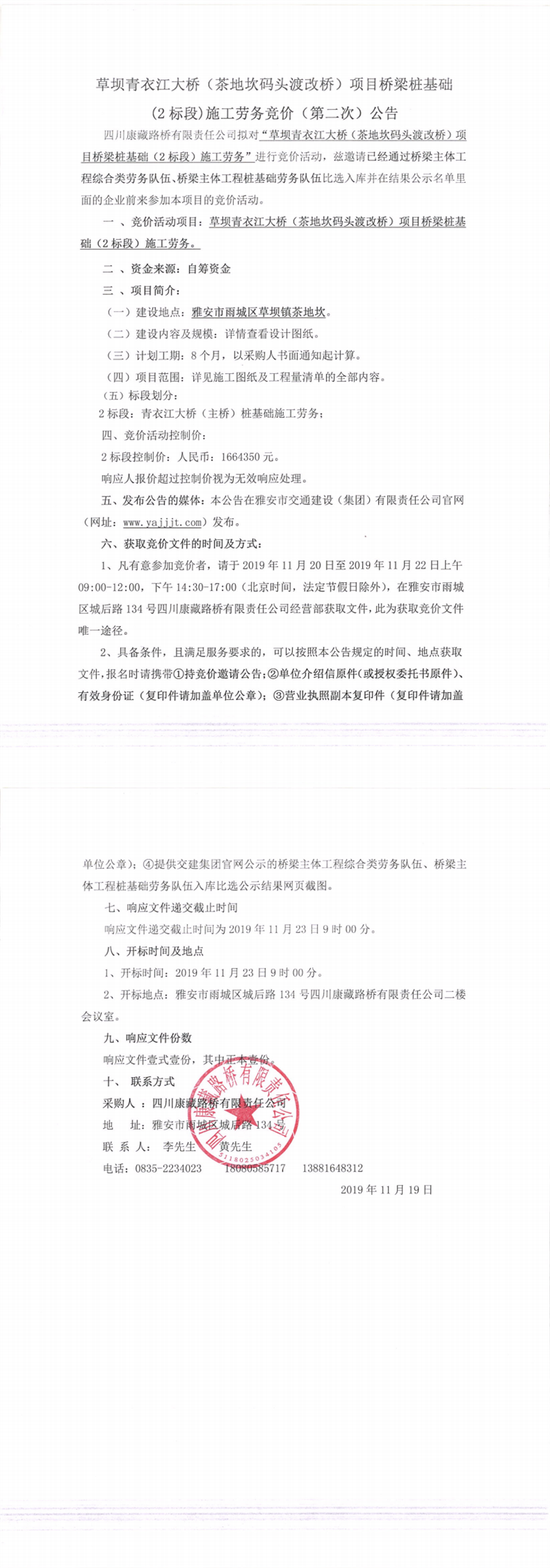 四川康藏路橋有限責(zé)任公司草壩青衣江大橋(茶地坎碼頭渡改橋)項目橋梁樁基礎(chǔ)(2標(biāo)段)施工勞務(wù)競價(第二次)公告