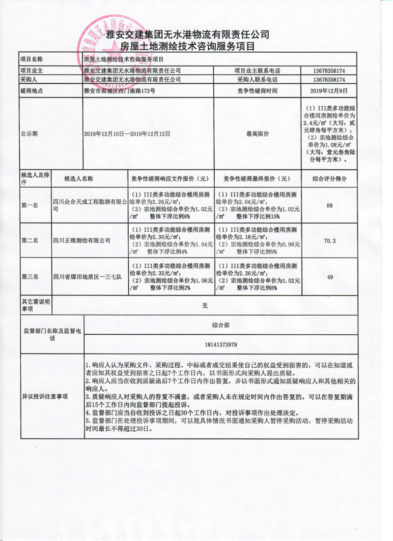 雅安交建集團(tuán)無水港物流有限責(zé)任公司房屋土地測繪技術(shù)咨詢服務(wù)項(xiàng)目競爭性磋商結(jié)果公示