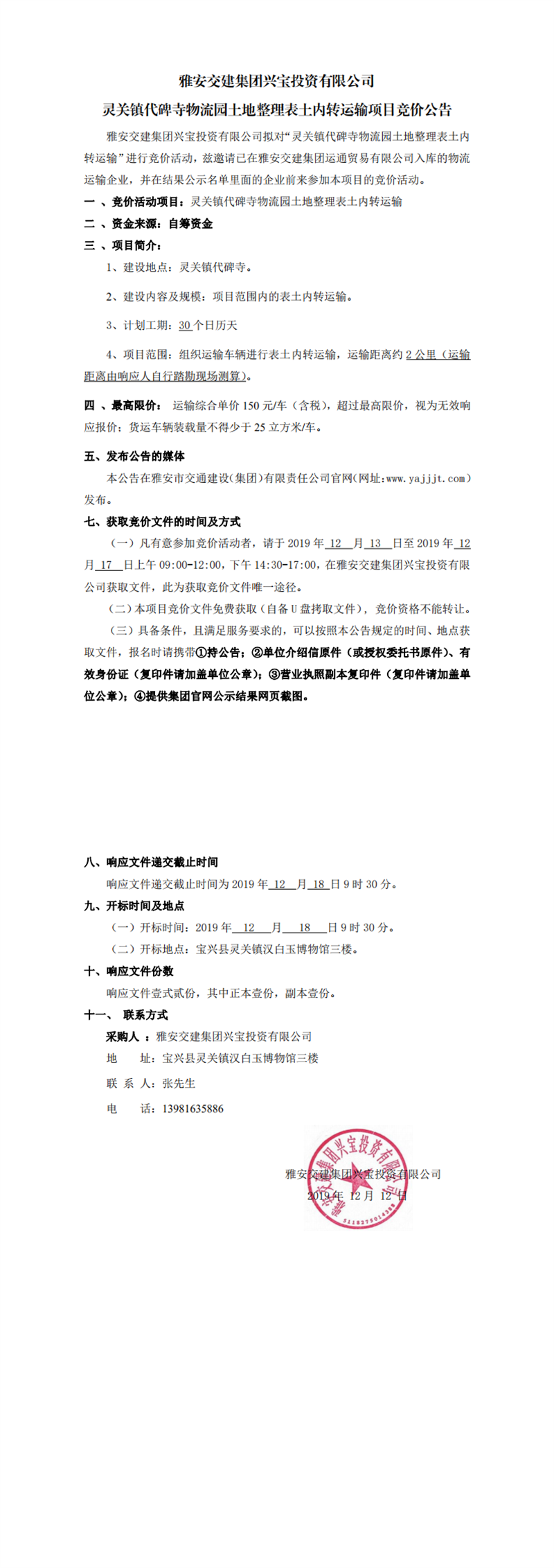 雅安交建集團興寶投資有限公司靈關(guān)鎮(zhèn)代碑寺物流園土地整理表土內(nèi)轉(zhuǎn)運輸項目競價公告