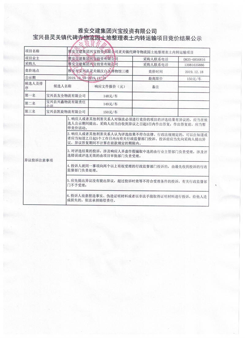 雅安交建集團(tuán)興寶投資有限公司寶興縣靈關(guān)鎮(zhèn)代碑寺物流園土地整理表土內(nèi)轉(zhuǎn)運(yùn)輸項(xiàng)目競(jìng)價(jià)結(jié)果公示