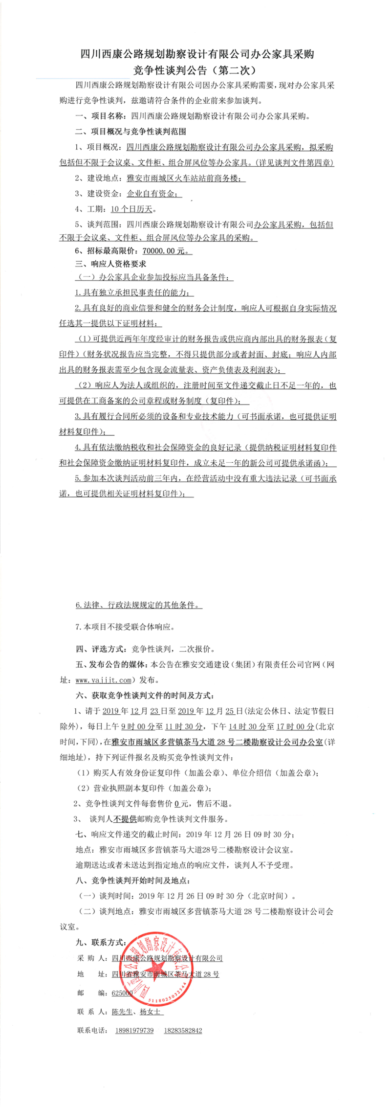 四川西康公路規(guī)劃勘察設(shè)計(jì)有限公司辦公家具采購競(jìng)爭(zhēng)性談判公告(第二次)