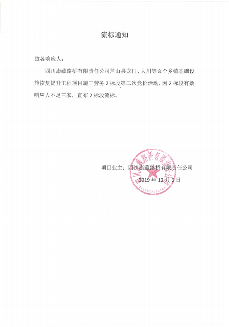 四川康藏路橋有限責任公司蘆山縣龍門、大川等8個鄉(xiāng)鎮(zhèn)基礎(chǔ)設(shè)施恢復提升工程項目施工勞務(wù)2標段第二次競價流標通知