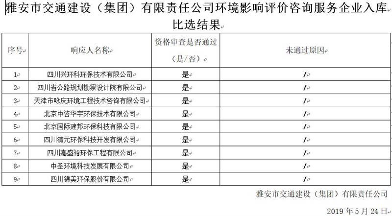 雅安市交通建設(shè)(集團(tuán))有限責(zé)任公司環(huán)境影響評(píng)價(jià)咨詢服務(wù)企業(yè)入庫比選結(jié)果公示