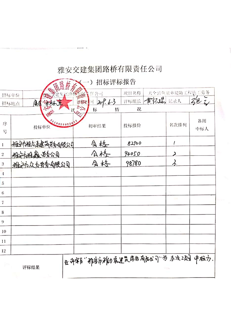 雅安交建集團路橋有限責任公司天全縣魚泉鄉(xiāng)堤防工程施工勞務項目邀請招標結果公示