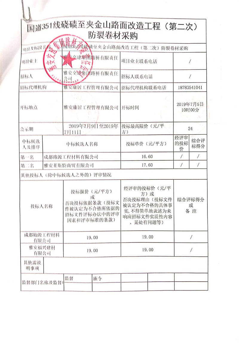 雅安交建集團(tuán)路橋有限責(zé)任公司國(guó)道351線(xiàn)磽磧至夾金山路面改造工程(第二次)防裂卷材采購(gòu)競(jìng)爭(zhēng)性談判結(jié)果公示