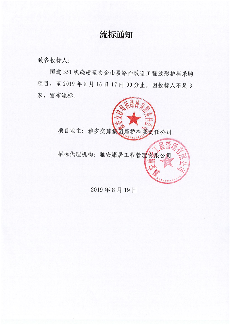雅安交建集團(tuán)路橋有限責(zé)任公司國(guó)道351線(xiàn)磽磧至夾金山段路面改造工程波形護(hù)欄采購(gòu)項(xiàng)目流標(biāo)通知