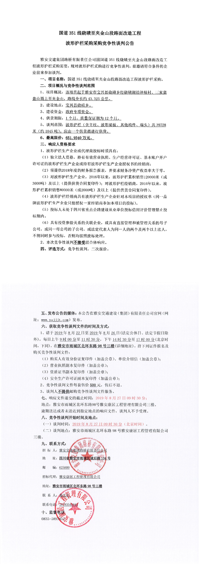 雅安交建集團(tuán)路橋有限責(zé)任公司國(guó)道351線磽磧至夾金山段路面改造工程波形護(hù)欄采購項(xiàng)目競(jìng)爭(zhēng)性談判公告