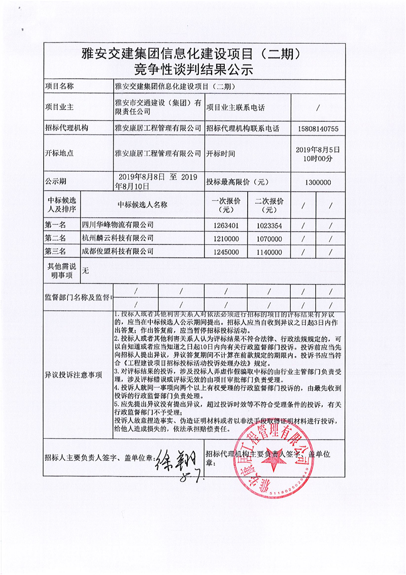 雅安交建集團(tuán)信息化建設(shè)項(xiàng)目(二期)競(jìng)爭(zhēng)性談判結(jié)果公示