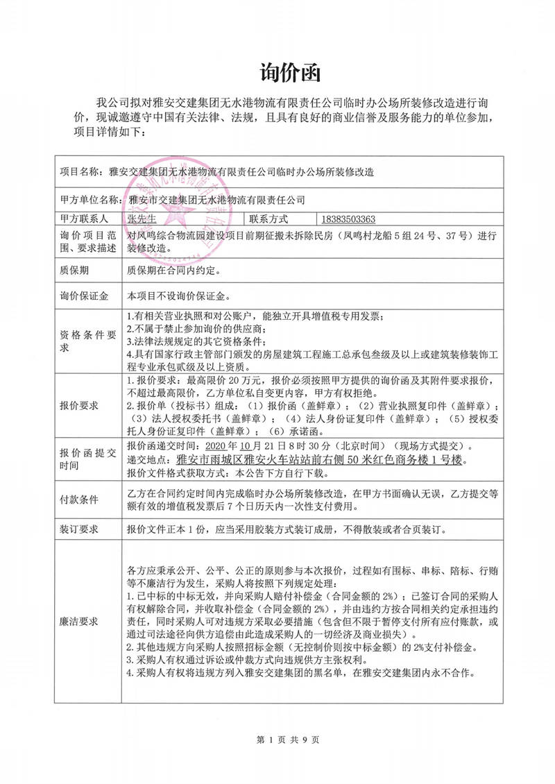 雅安交建集團(tuán)無水港物流有限責(zé)任公司臨時(shí)辦公場(chǎng)所裝修改造詢價(jià)函