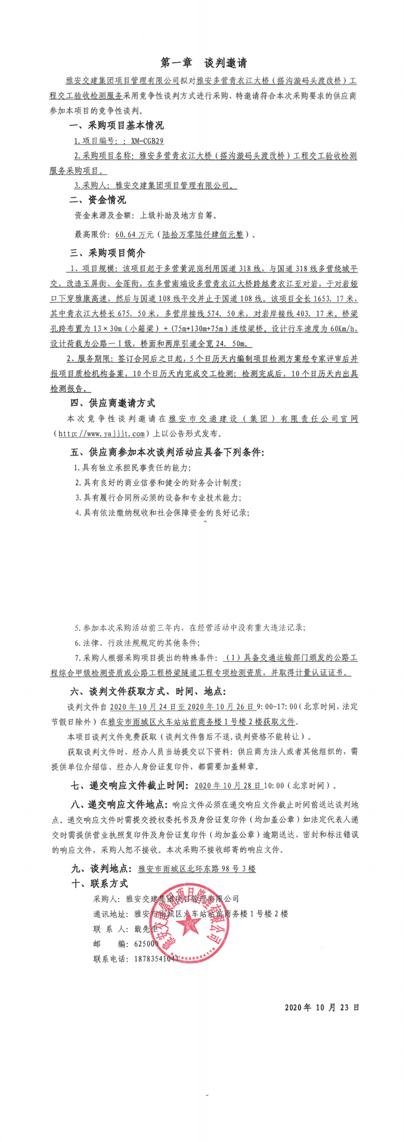 雅安交建集團項目管理有限公司雅安多營青衣江大橋(搭溝漩碼頭渡改橋)工程交工驗收檢測服務采購項目競爭性談判公告