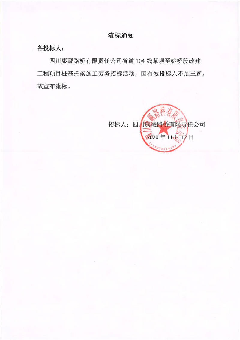 四川康藏路橋有限責任公司省道104線草壩至姚橋段改建工程項目樁基托梁施工勞務流標通知