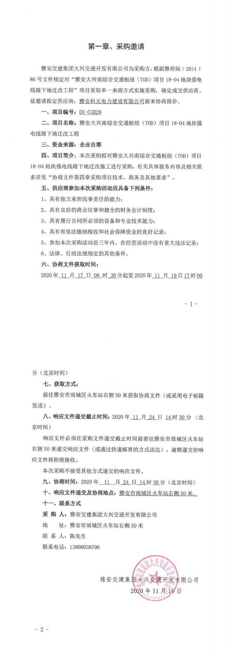 雅安交建集團(tuán)大興交通開發(fā)有限公司雅安大興南綜合交通樞紐(TOD)項目18-04地塊強(qiáng)電線路下地遷改工程單一來源采購邀請