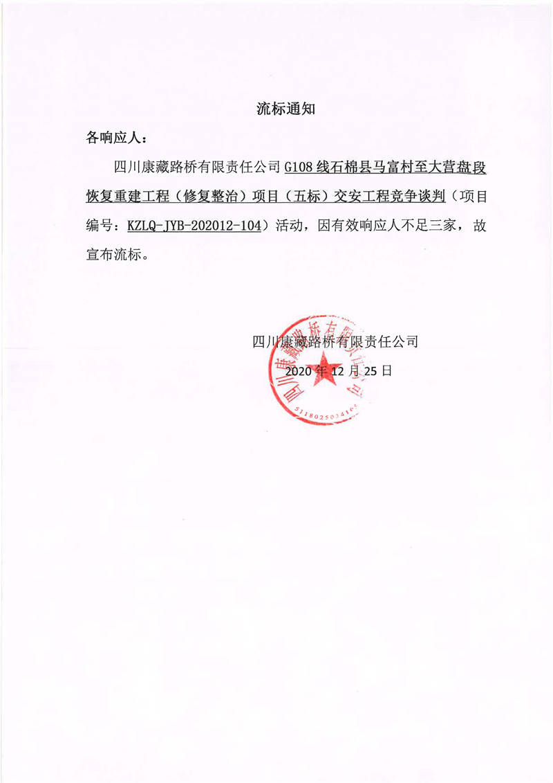 四川康藏路橋有限責任公司G108線石棉縣馬富村至大營盤段恢復(fù)重建工程(修復(fù)整治)項目(五標)交安工程流標通知