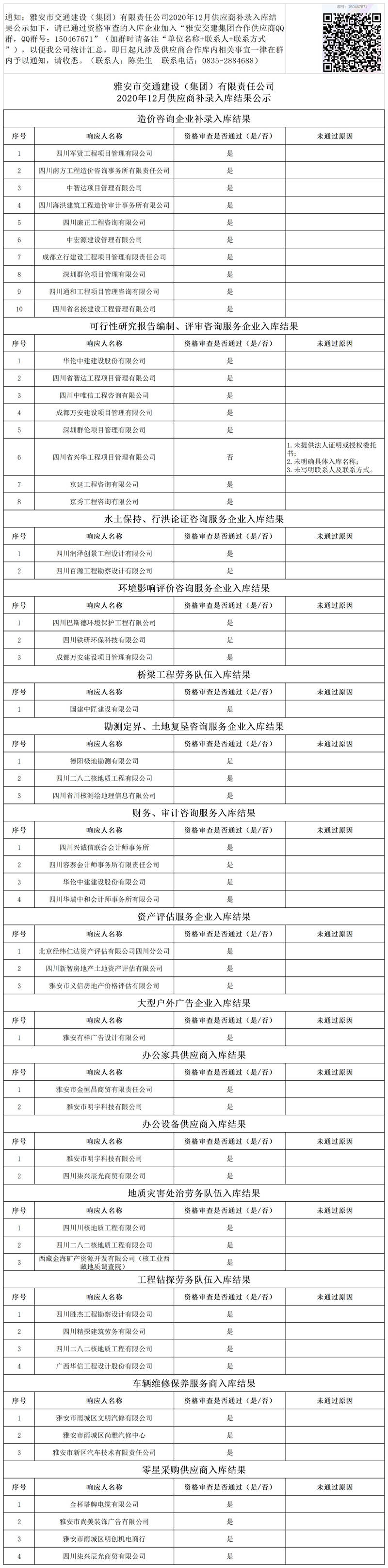 雅安市交通建設(shè)(集團(tuán))有限責(zé)任公司2020年12月供應(yīng)商補(bǔ)錄入庫(kù)結(jié)果公示