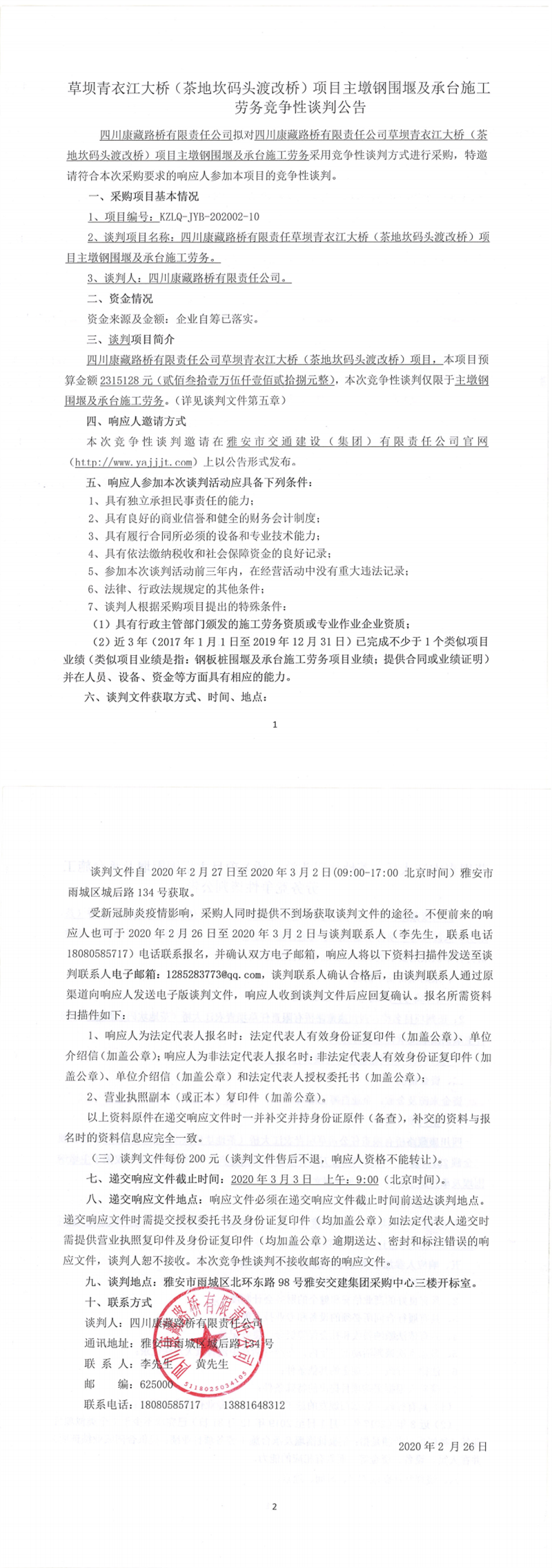 四川康藏路橋有限責任公司草壩青衣江大橋(茶地坎碼頭渡改橋)項目主墩鋼圍堰及承臺施工勞務競爭性談判公告