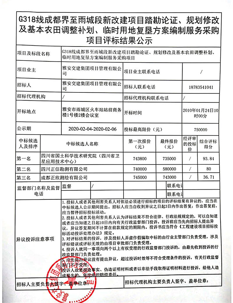 雅安交建集團(tuán)項目管理有限公司G318線成都界至雨城段新改建項目踏勘論證、規(guī)劃修改及基本農(nóng)田調(diào)整補劃、臨時用地復(fù)墾方案編制服務(wù)采購項目評標(biāo)結(jié)果公示