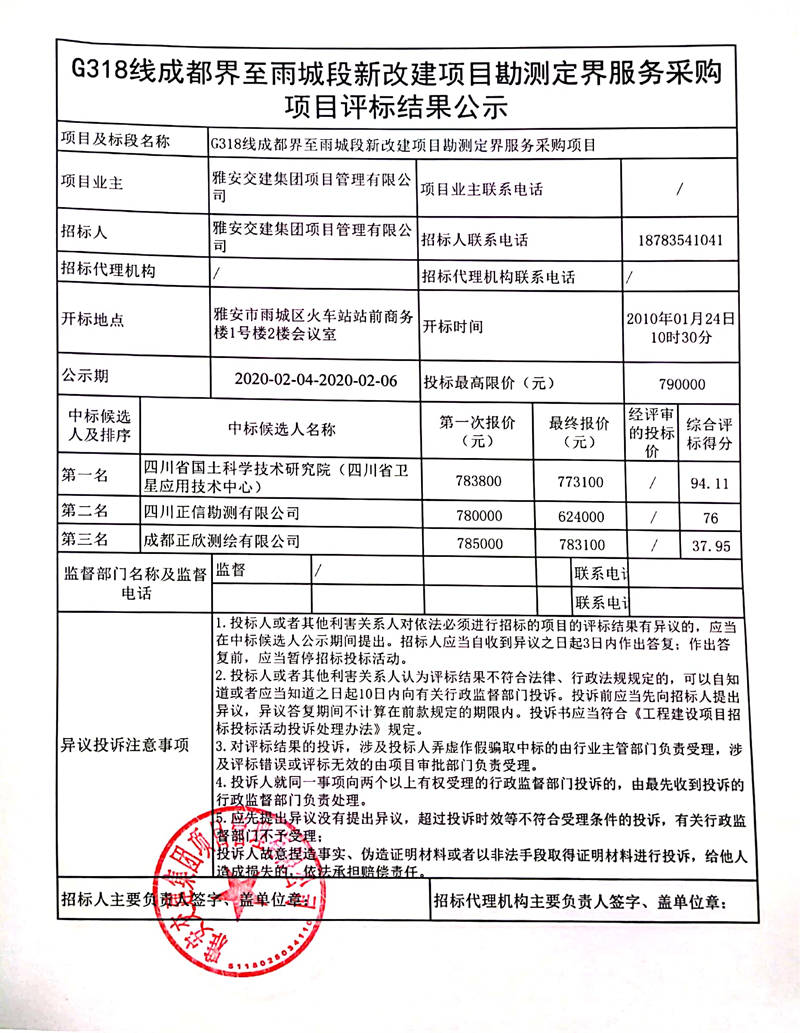 雅安交建集團項目管理有限公司G318線成都界至雨城段新改建項目勘測定界服務(wù)采購項目評標(biāo)結(jié)果公示
