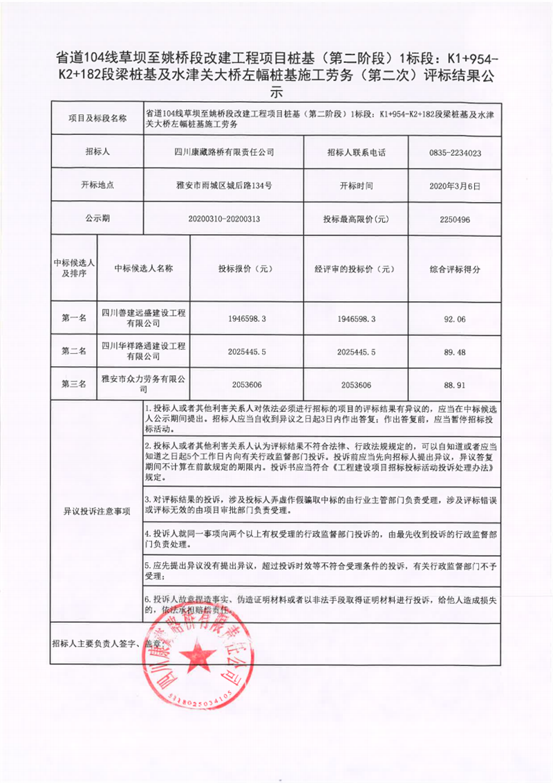 四川康藏路橋有限責(zé)任公司省道104線草壩至姚橋段改建工程項(xiàng)目樁基(第二階段)1標(biāo)段:K1+954-K2+182段梁樁基及水津關(guān)大橋左幅樁基施工勞務(wù)(第二次)評標(biāo)結(jié)果公示