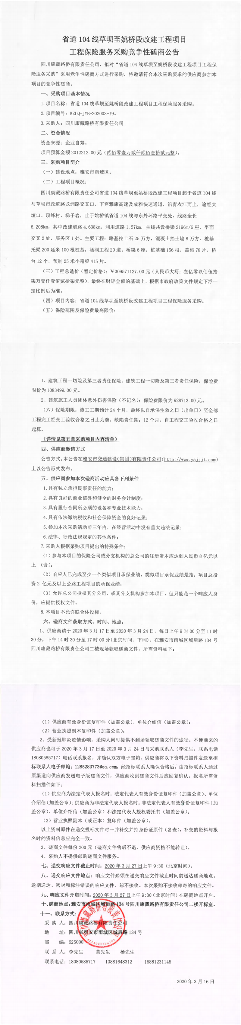 四川康藏路橋有限責任公司省道104線草壩至姚橋段改建工程項目工程保險服務采購競爭性磋商公告