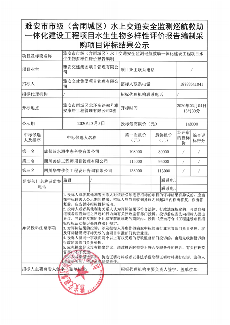 雅安交建集團項目管理有限公司雅安市市級(含雨城區(qū))水上交通安全監(jiān)測巡航救助一體化建設工程項目水生生物多樣性評價報告編制采購項目評標結(jié)果公示