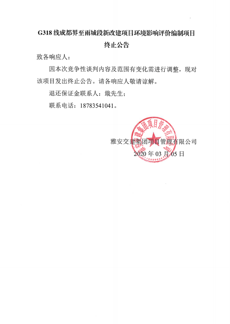 雅安交建集團(tuán)項(xiàng)目管理有限公司G318線成都界至雨城段新改建項(xiàng)目環(huán)境影響評(píng)價(jià)編制項(xiàng)目終止公告