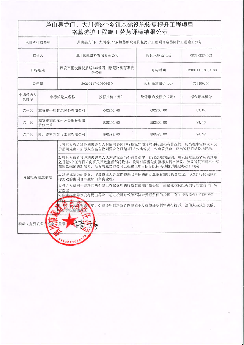四川康藏路橋有限責(zé)任公司蘆山縣龍門、大川等8個鄉(xiāng)鎮(zhèn)基礎(chǔ)設(shè)施恢復(fù)提升工程項目路基防護工程施工勞務(wù)評標(biāo)結(jié)果公示