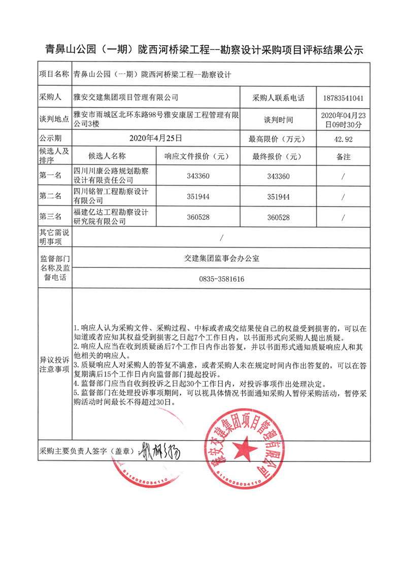 雅安交建集團項目管理有限公司青鼻山公園(一期)隴西河橋梁工程項目勘察設(shè)計采購項目評標結(jié)果公示