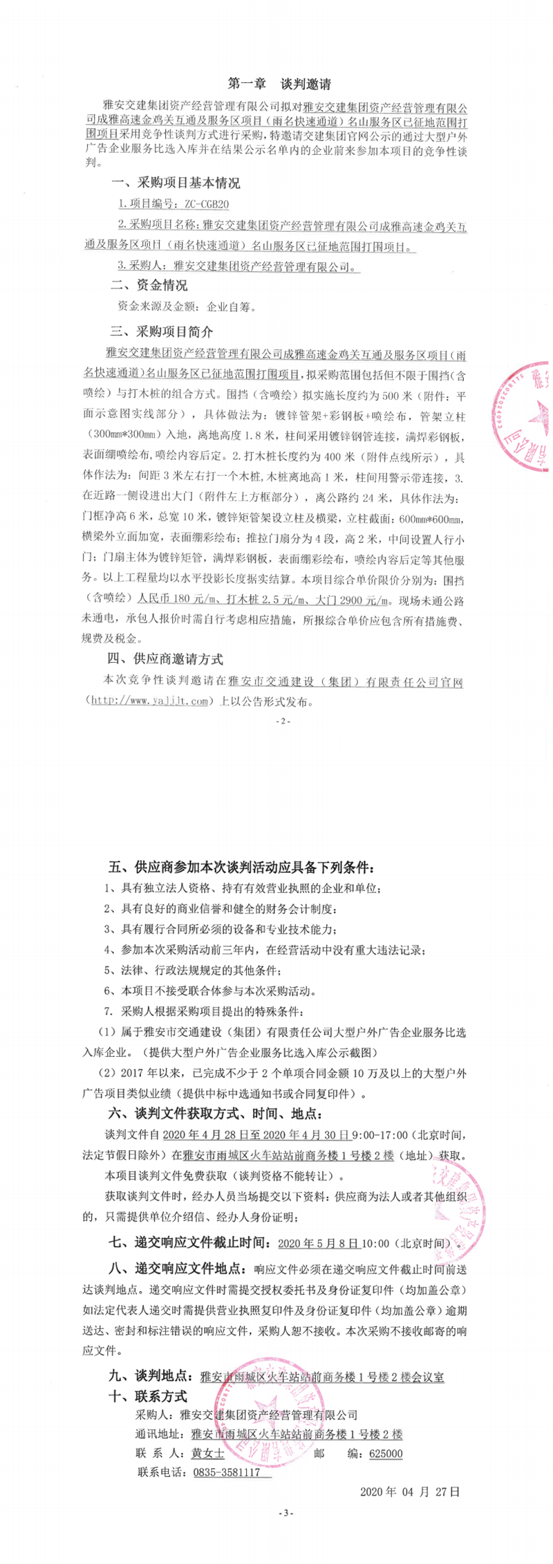 雅安交建集團資產(chǎn)經(jīng)營管理有限公司成雅高速金雞關互通及服務區(qū)項目(雨名快速通道)名山服務區(qū)已征地范圍打圍項目競爭性談判公告