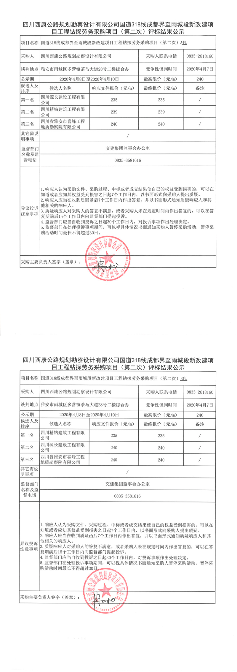 四川西康公路規(guī)劃勘察設(shè)計有限公司國道318線成都界至雨城段新改建項目工程鉆探勞務采購項目(第二次)評標結(jié)果公示