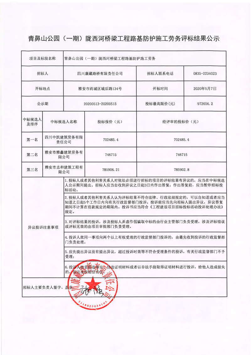 四川康藏路橋有限責(zé)任公司青鼻山公園(一期)隴西河橋梁工程路基防護(hù)施工勞務(wù)評標(biāo)結(jié)果公示