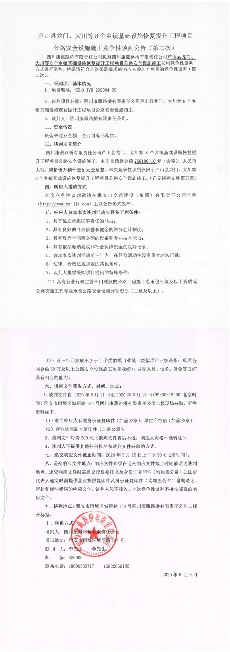 四川康藏路橋有限責任公司蘆山縣龍門、大川等8個鄉(xiāng)鎮(zhèn)基礎設施恢復提升工程項目公路安全設施施工競爭性談判公告(第二次)
