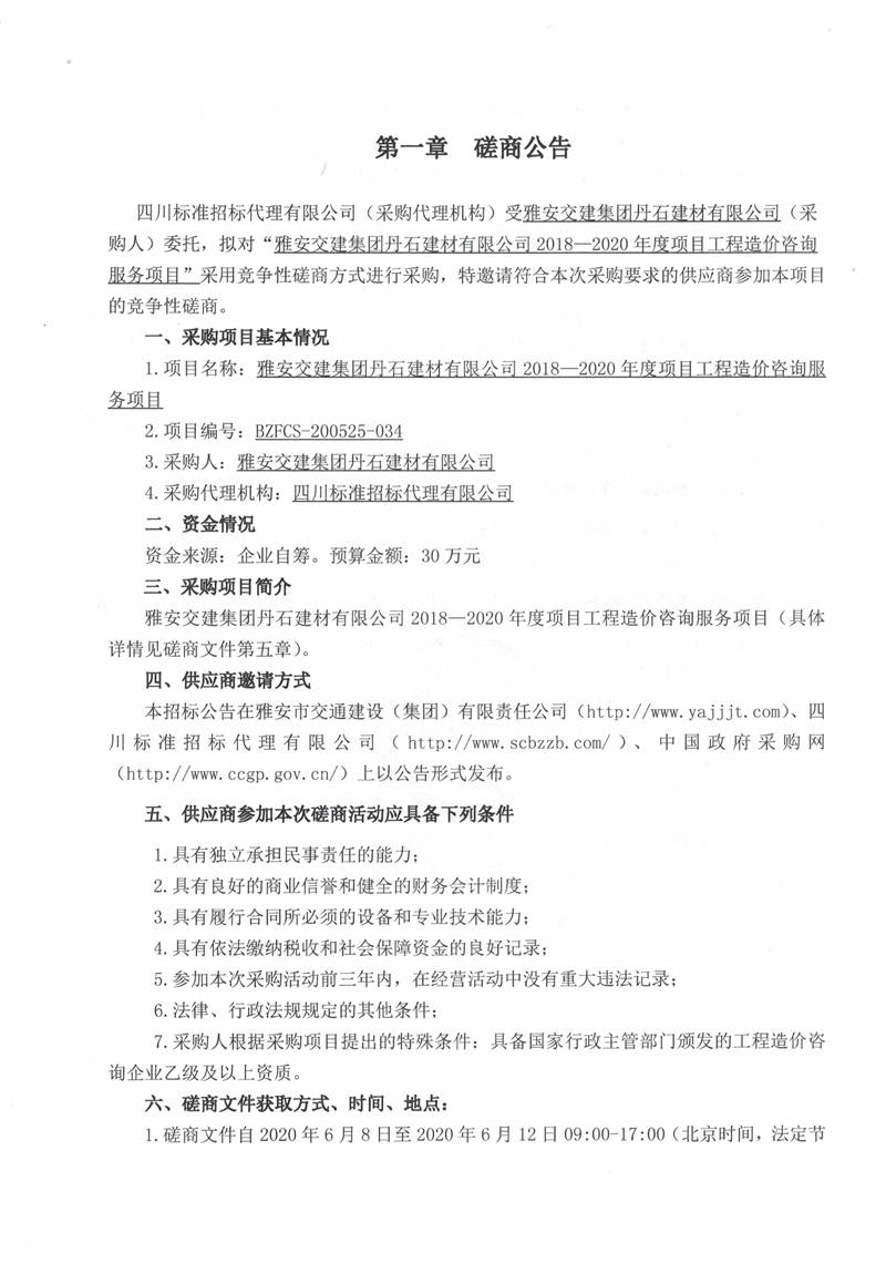 雅安交建集團(tuán)丹石建材有限公司2018—2020年度項(xiàng)目工程造價(jià)咨詢服務(wù)項(xiàng)目競(jìng)爭(zhēng)性磋商公告