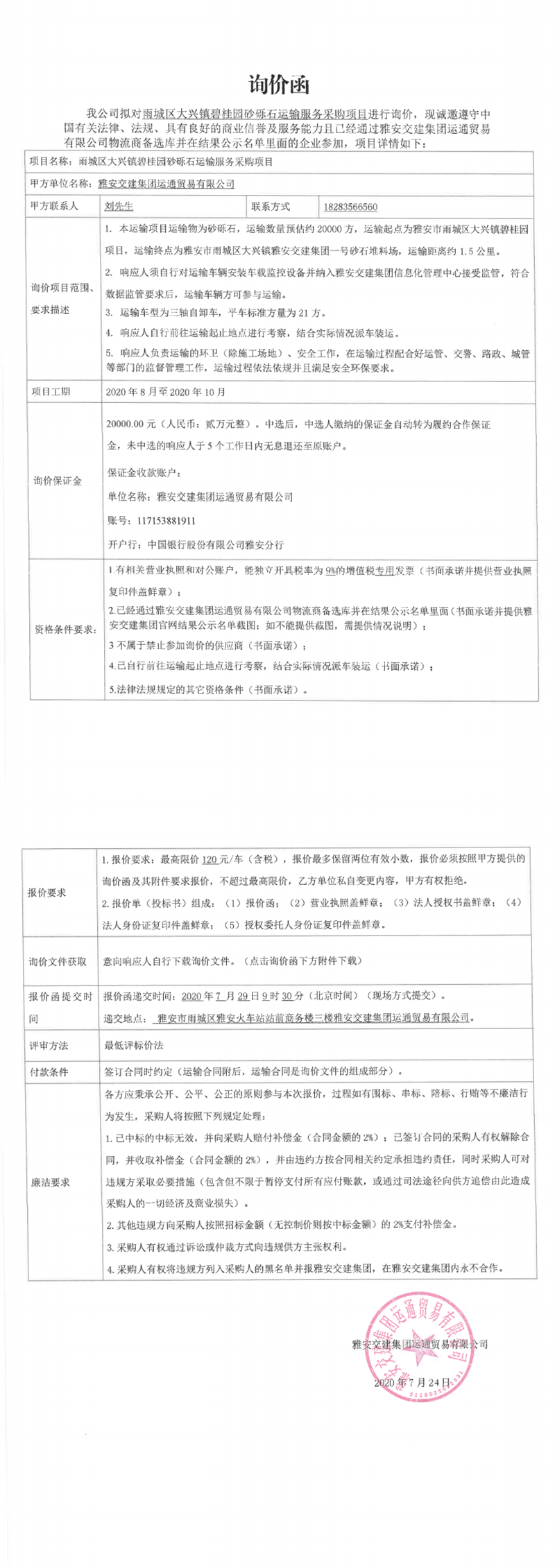 雅安交建集團(tuán)運(yùn)通貿(mào)易有限公司雨城區(qū)大興鎮(zhèn)碧桂園砂礫石運(yùn)輸服務(wù)采購(gòu)項(xiàng)目詢(xún)價(jià)函