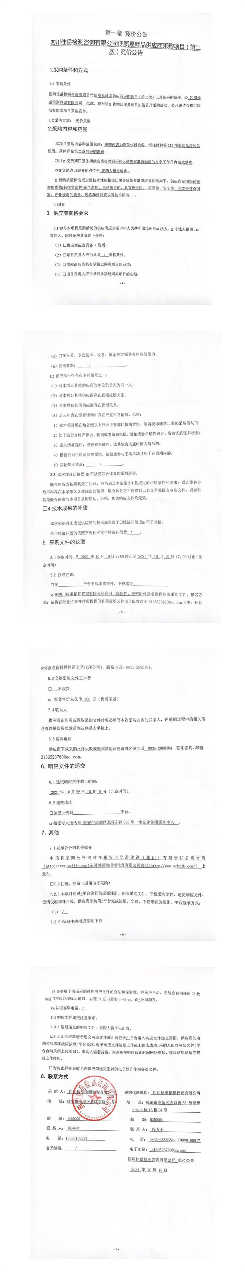 四川佳岳檢測咨詢有限公司低質(zhì)易耗品供應(yīng)商采購項目(第二次)競價公告