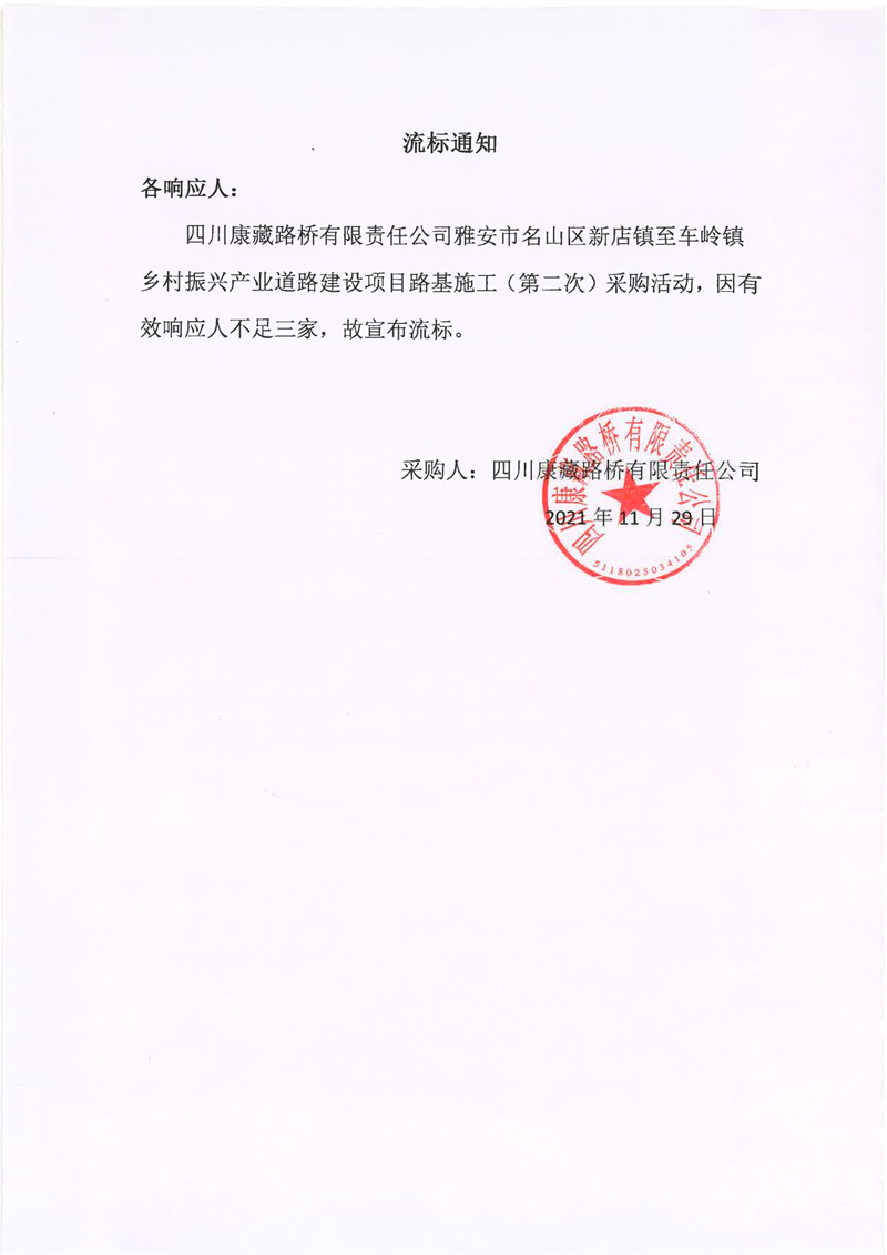 四川康藏路橋有限責(zé)任公司雅安市名山區(qū)新店鎮(zhèn)至車(chē)嶺鎮(zhèn)鄉(xiāng)村振興產(chǎn)業(yè)道路建設(shè)項(xiàng)目路基施工(第二次)流標(biāo)通知
