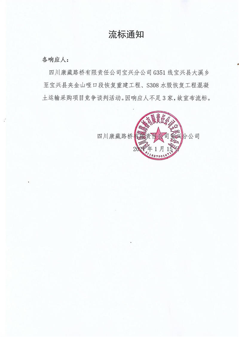 四川康藏路橋有限責任公司寶興分公司G351線寶興縣大溪鄉(xiāng)至寶興縣夾金山啞口段恢復重建工程、S308水毀恢復工程混凝土運輸采購項目流標通知