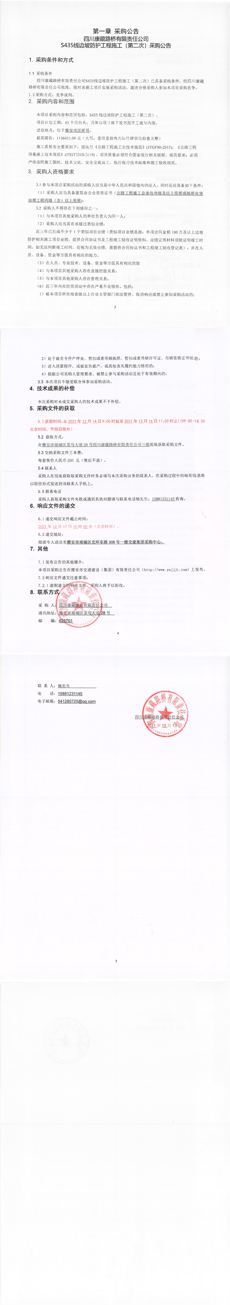 四川康藏路橋有限責任公司S435線邊坡防護工程施工(第二次)采購公告