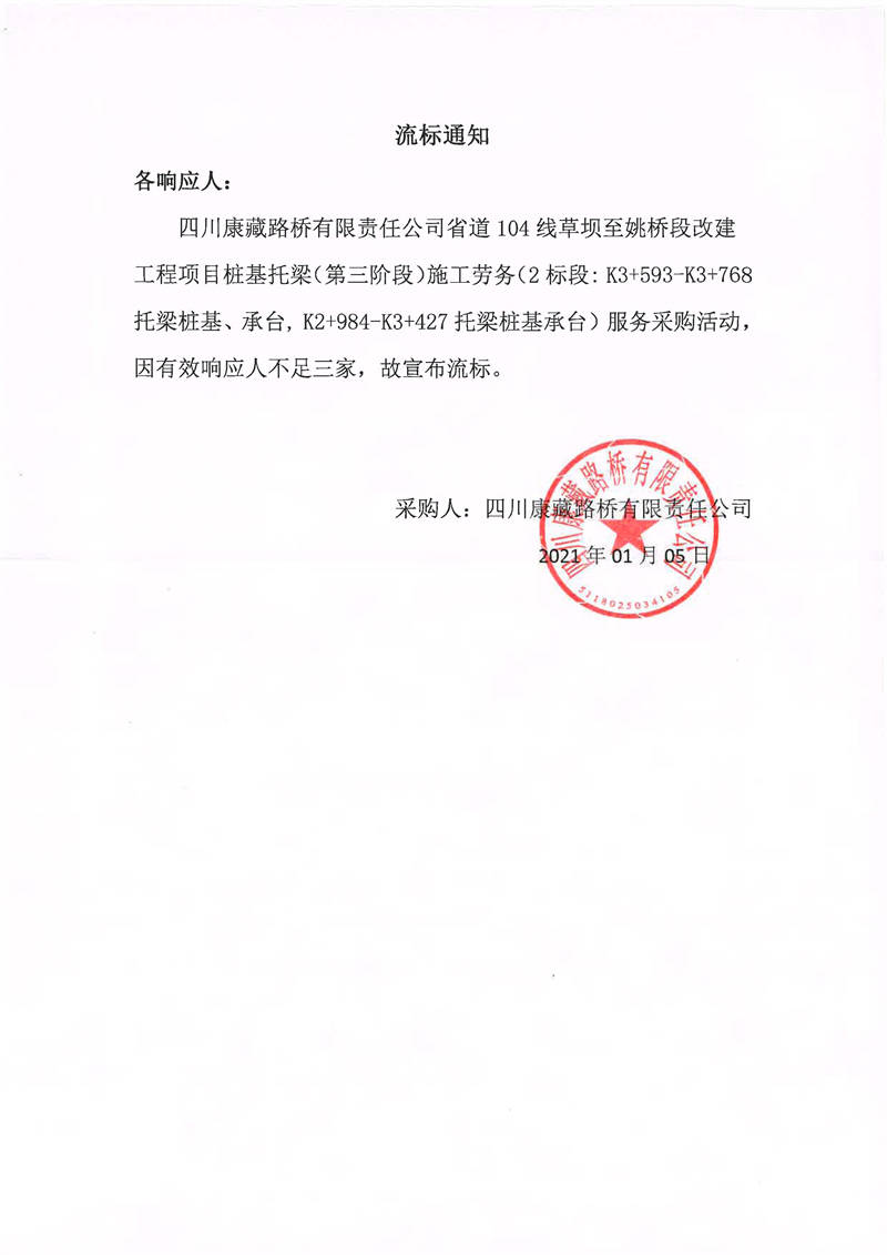 四川康藏路橋有限責(zé)任公司省道104線草壩至姚橋段改建工程項目樁基托梁(第三階段)施工勞務(wù)服務(wù)2標(biāo)段流標(biāo)通知