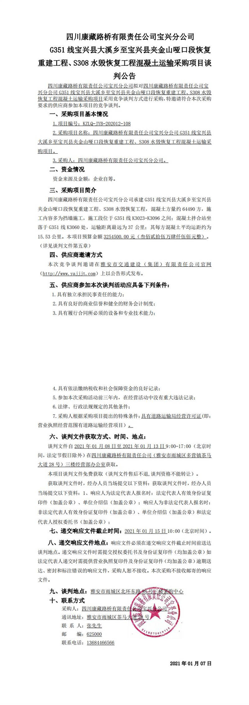 四川康藏路橋有限責(zé)任公司寶興分公司G351線(xiàn)寶興縣大溪鄉(xiāng)至寶興縣夾金山啞口段恢復(fù)重建工程、S308水毀恢復(fù)工程混凝土運(yùn)輸采購(gòu)項(xiàng)目談判公告