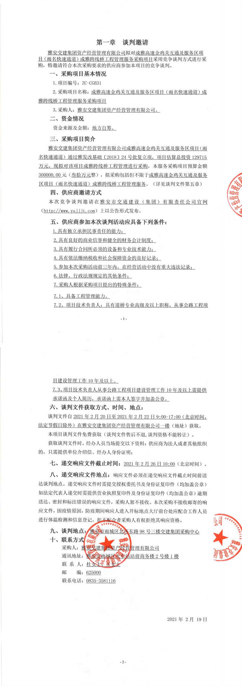 雅安交建集團(tuán)資產(chǎn)經(jīng)營(yíng)管理有限公司成雅高速金雞關(guān)互通及服務(wù)區(qū)項(xiàng)目(雨名快速通道)成雅跨線橋工程管理服務(wù)采購項(xiàng)目競(jìng)爭(zhēng)談判公告