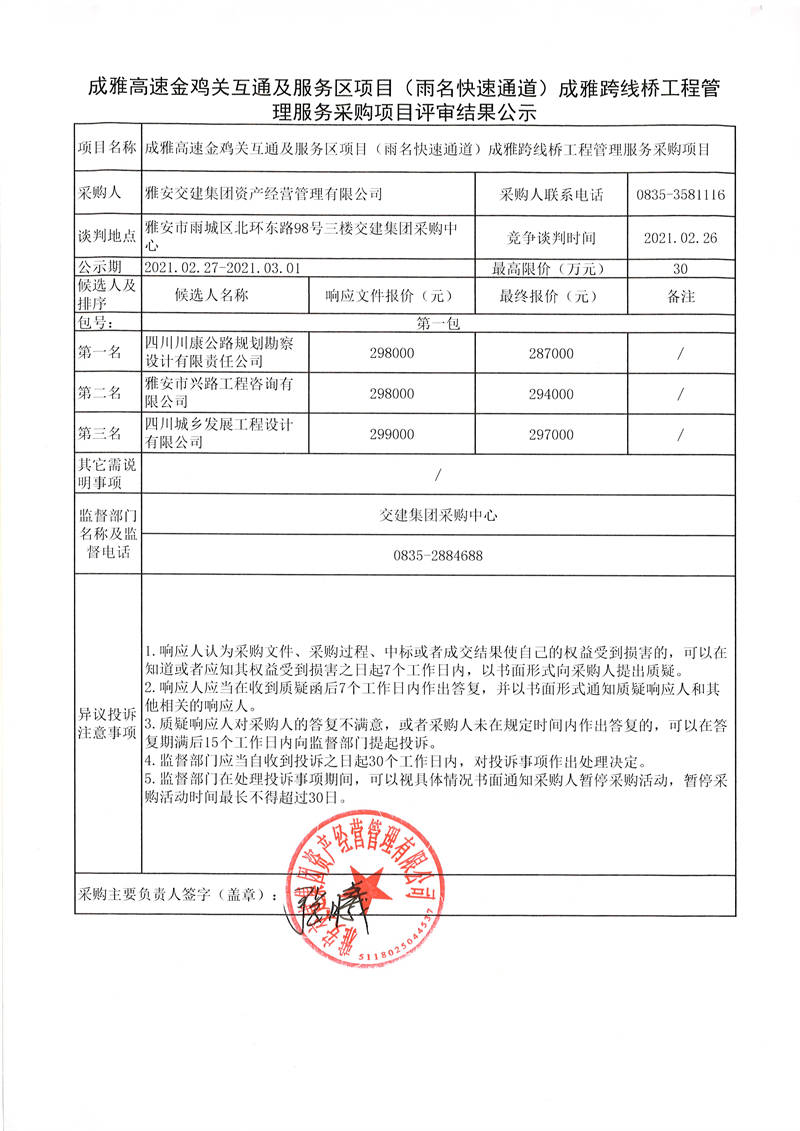 雅安交建集團(tuán)資產(chǎn)經(jīng)營管理有限公司成雅高速金雞關(guān)互通及服務(wù)區(qū)項目(雨名快速通道)成雅跨線橋工程管理服務(wù)采購項目評審結(jié)果公示