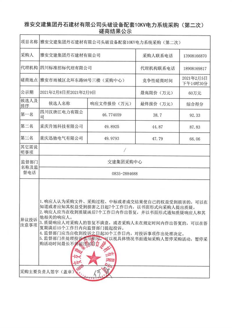雅安交建集團丹石建材有限公司頭破設(shè)備配套10KV電力系統(tǒng)采購(第二次)磋商結(jié)果公示