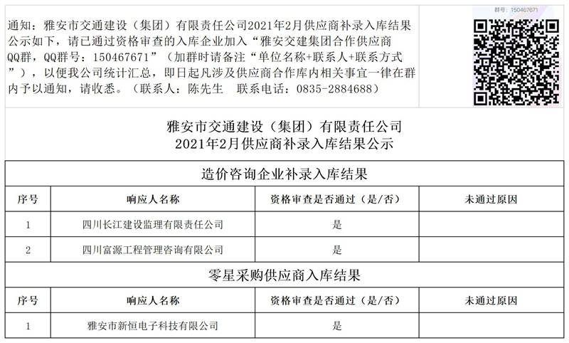 雅安市交通建設(shè)(集團(tuán))有限責(zé)任公司2021年2月供應(yīng)商補(bǔ)錄入庫(kù)結(jié)果公示