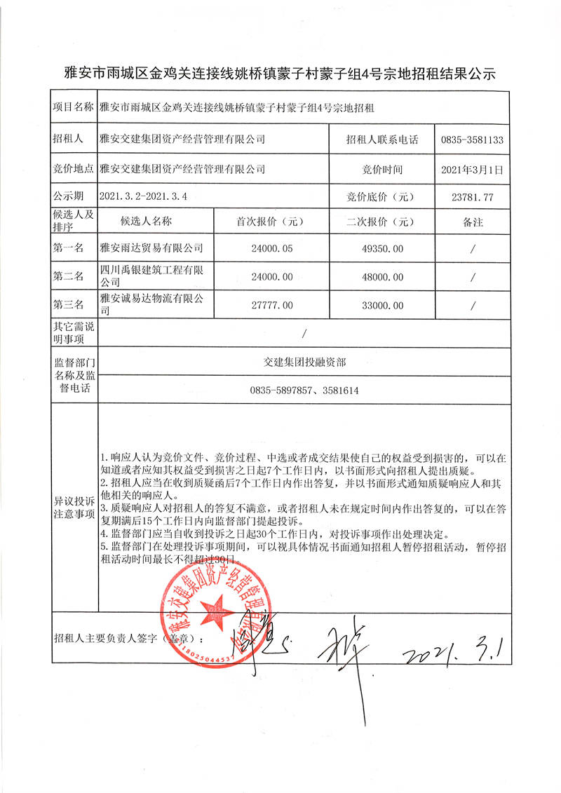 雅安交建集團(tuán)資產(chǎn)經(jīng)營(yíng)管理有限公司雅安市雨城區(qū)金雞關(guān)連接線姚橋鎮(zhèn)蒙子村蒙子組4號(hào)宗地招租結(jié)果公示